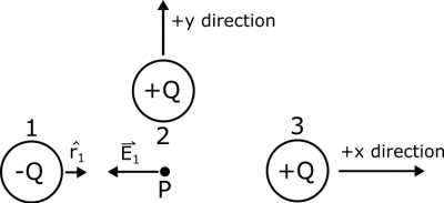 First, let's find the contribution from Charge 1. The separation vector $\vec{r}_1$ points from the source to the observation ($1\rightarrow P$), so $\vec{r}_1 = 2R\hat{x}$, and $$\hat{r_1}=\frac{\vec{r}_1}{|r_1|}=\frac{2R\hat{x}}{2R}=\hat{x}$$ Visually, this is what we know about $\hat{r_1}$, and what we expect for $\vec{E}_1$, since Charge 1 is negative:
