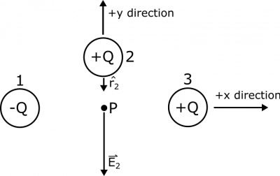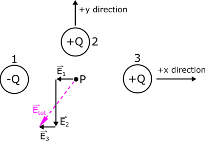 - We can use superposition to add electric field contributions from the point charges (vector superposition): $\vec{E}_{tot}=\vec{E}_{1}+\vec{E}_{2}+\vec{E}_3$.