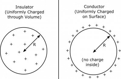Suppose you have an insulating ball that has been charged somehow. The charging was very thorough and it seems like the ball is pretty much uniformly charged. It has a charge $Q$ and a radius $R$. What is the electric field at a distance $r$ from the center of the ball? Be sure to account for both cases $r<R$ (inside the ball) and $r>R$ (outside the ball). You may find Gauss' Law to be useful here. Repeat for the case when the ball is a conductor.