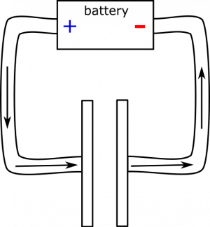 During this time, the current is smaller than at the beginning, but it is also decreasing at a slower rate, since the plates are not charging as quickly, which means the electric field is not diminishing as quickly. The current actually decays exponentially, though this is not necessary knowledge for the qualitative graph. Before we produce our graphs, it is also useful to represent the circuit at a time after the capacitor has been “fully charged” (limited by the potential difference of the power source), which was our practical assumption. At this point, the charge on the plates fully opposes the electric field from the power source, and as a result no current exists in the circuit.