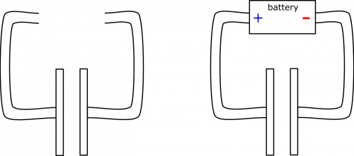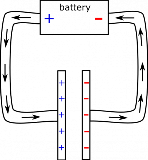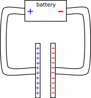 - We represent the setup below. The capacitor is pictured both disconnected and hooked up to the power source.