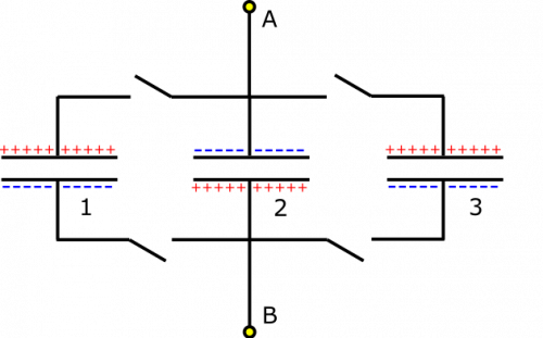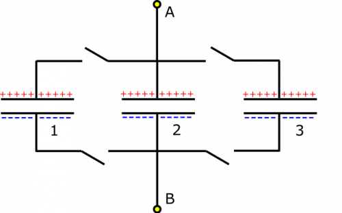 Suppose you have the following setup of already-charged capacitors. The positive plates are all on the top half of the circuit. Capacitors are labeled 1 through 3 for convenience of reference, and the sign of the charge on the plates is indicated. You know that $Q_1 = Q_2 = Q_3 = 1 \text{ mC}$, and $\Delta V_1 = \Delta V_2 = \Delta V_3 = 20 \text{ V}$. Part 1: What is the equivalent capacitance (if the switches are closed) from Node A to Node B? What happens after the switches are closed? Part 2: What if Capacitor 2 were flipped?