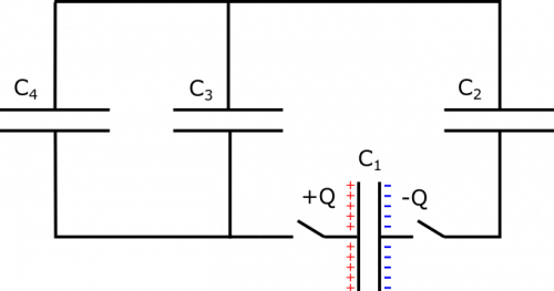 • Capacitor 1 is charged to $Q$ and $-Q$ on its plates.