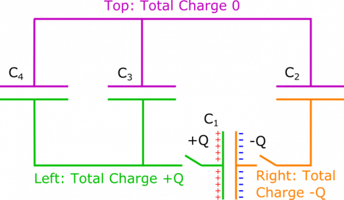 Next, we want to understand what the circuit will look like when it has reached a steady state. Since there is no battery, we know this point has been reached when there is no current in the wire. We will refer to the circuit with no resistors because we do not care about resistance when there is no current ($\Delta V = (0)R$). We only care that there is no potential difference across the strips of wire, since this is the only way there can be no current. We want all the potential differences in the circuit to be across the capacitors. Below, we split the circuit into three sections, across which charge cannot flow, since the plates of the capacitors do not touch.