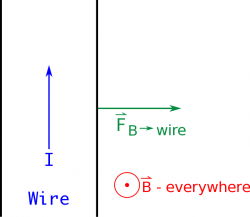 where |$\vec{F}_{wire}$| is the magnitude of the force on the whole wire, $I$ is the current through the wire, $B$ is the external magnetic field, $L$ is the length of the wire, and $\theta$ is the angle between the magnetic field and the length of the wire. Remember though that this equation is only good for straight wires with constant current that are in a constant magnetic field - because of all the assumptions that we made to get to this point.
