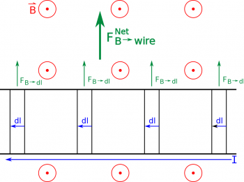 Note: that the force is still given by the cross product between the $d\vec{l}$ and the $\vec{B}$, so the force on the piece of wire is still perpendicular to both the direction of the moving charges ($d\vec{l}$) and perpendicular to the magnetic field ($\vec{B}$). This means we can still use the right hand rule to figure out the direction of the $d\vec{F}$.