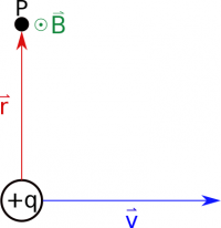 $$\vec{B} = \dfrac{\mu_0}{4 \pi}\dfrac{q \vec{v}\times \hat{r}}{r^2}.$$