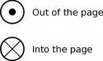 However, because we are dealing with the cross product, we need to be able to denote when a vector would be pointing into or out of the page/screen. We will do this by using either a circle with a dot inside to represent a vector pointing out of the page/screen or a circle with an x inside to represent a vector pointing into the page/screen. An easy way to remember this is to think of an arrow coming toward you (you would see the point so only a dot) or an arrow going away from you (you would see the cross of the tail feathers). A belly button analogy can also work nicely.