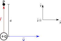 For example, consider a charge q moving in the $+\hat{x}$ direction. We want to know the magnetic field at point P, which is a distance d away from the charge in the $\hat{y}$ direction at the instant the moving change is at the origin (see the set up below). Here, notice that we must be specific about when we want to find the magnetic field. Because the charge is moving, it will be at a different location at different times – our solution is only accurate for a particular time/location of the charge. We can find the magnetic field by using the equation above: $$\vec{B}=\frac{\mu_0}{4 \pi}\frac{q\vec{v}\times \vec{r}}{r^3}$$ where our separation vector is $\vec{r}=d \hat{y}$ since it points from the charge to our point of interest. In this case then: $$\vec{B}=\frac{\mu_0}{4 \pi}\frac{q \cdot v \hat{x} \times d \hat{y}}{d^3}$$ We can pull the constants out, and focus on the cross product then: $$\vec{B}=\frac{\mu_0}{4 \pi}\frac{q \cdot v \cdot d}{d^3}\hat{x} \times \hat{y}$$ We can rewrite $\hat{x}=\langle 1,0,0 \rangle$ and $\hat{y}=\langle 0,1,0 \rangle$, and plug that into the general equation for a cross product: $$\vec{B} \times \vec{C} = \langle B_yC_z - C_yB_z, C_xB_z-B_x C_z, B_xC_y - C_xB_y\rangle$$ $$\hat{x} \times \hat{y} = \langle (0\cdot0)-(1\cdot0), (0\cdot0)-(1\cdot0), (1\cdot1)-(0\cdot0) \rangle$$ $$\hat{x} \times \hat{y} = \langle 0,0,1 \rangle = \hat{z}$$ So we get that the magnetic field at P should point out of the page.
