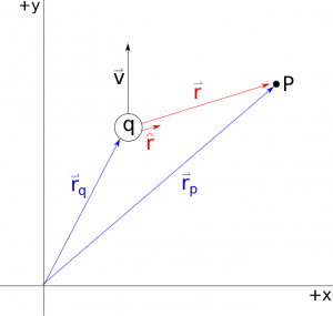 - Separation Distance - the $r$ in this equation should feel very familiar from all the work we did with electric fields and potentials. In this equation, this is still the same magnitude of the separation vector that points from the source (the moving charge in this case) to the observation point (P in this case). Mathematically, we can still find the magnitude of this vector using: