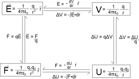 The figure below summarizes the general relationships between the four quantities. These relationships are always true. It does not matter if you have a point charge, a sphere of charge, a cylinder of charge, or a random blob of charge - these relationships will always be true.