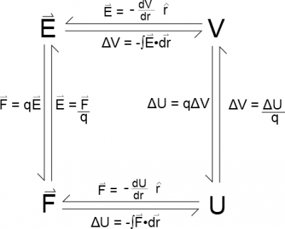 The figure below summarizes the general relationships between the four quantities. These relationships are always true. It does not matter if you have a point charge, a sphere of charge, a cylinder of charge, or a random blob of charge - these relationships will always be true.