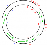 This is all well and good until we return to the top of the loop. At the top of the loop, there would be a large change in the surface charges (shown in Fig. 2 to the left), which would create an electric field that points in the opposite direction! (Remember electric fields point away from positive charges and towards negative charges.) This is very problematic and would not result in a constant current. On top of that, the drastic change from negatives to positives would imply that there's a large change in voltage at that spot. We were ok with this before because there was a battery at that location to justify that change in voltage, but now there's only a wire. It doesn't make sense for there to be a drastic change in voltage in only one spot in the wire. This tells us that it is NOT surface charges that are creating the electric field in this case. Something else must be creating an electric field that is driving the current in the loop.