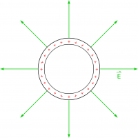 So far, the only other source of electric fields that we know about is charges, but we didn't charge the loop ahead of time to create this electric field (e.g., we did not rub it with a piece of felt or connect it to a battery). We only moved a magnet towards a loop of wire. Even if we had charged the loop (say we charge it positively for example), the electric field from those excess charges would point away from the loop - not around the loop (shown in the Fig. 3 to the left). So all of our previous ideas do not make sense for the this context. It cannot be surface charges making the electric field because the E-field isn't constant. It cannot be excess charges making the E-field because the field would point outwards and not around the loop.