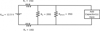 On one of Dr. Jackie Walzule's Jeep expeditions in the Upper Penisula, her phone charger cable suddenly stops working and she desperately needs her phone for directions/GPS. Isolated in the UP, she must pull a “MacGuyver” and create a charging circuit from the various circuit elements in her car's emergency kit. (Yes she carries circuit elements in her car for just such an occasion.) Dr. Jackie has started to draw out a circuit diagram that uses her car battery as a power source (12.5 V), but she is worried if she directly connects her phone to it, the battery will completely fry her phone. Instead, she has decided that it would be best to use the car battery to charge some capacitors and then discharge those through the phone.